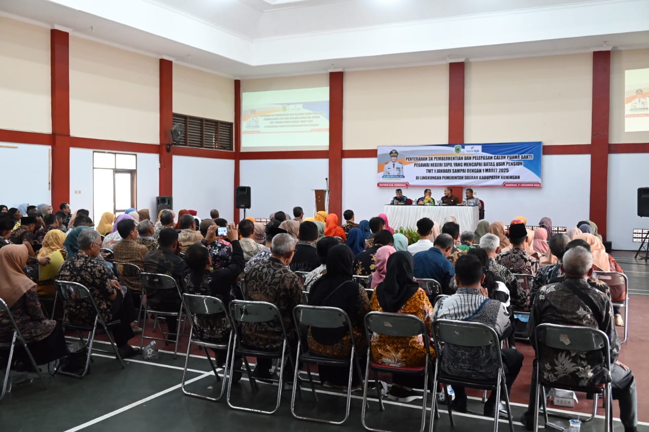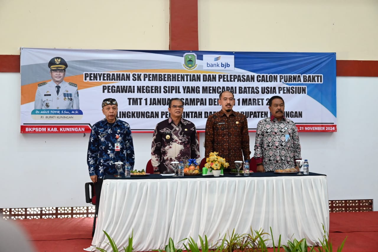 KUNINGAN – Penjabat Bupati Kuningan Dr. Agus Toyib, S.Sos., M.Si., serahkan SK Pemberhentian kepada calon Purna Bhakti PNS yang mencapai batas usia pensiun (BUP) TMT 1 januari sampai dengan 1 maret 2025 sebanyak 128 orang di lingkungan Pemerintah Kabupaten Kuningan, bertempat di Graha Sajati BKPSDM Kabupaten Kuningan, kamis (21/11/2024).